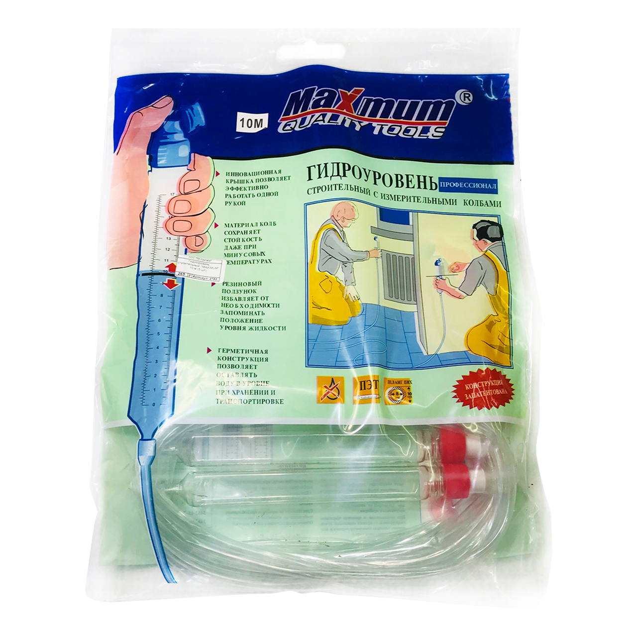 Водяной уровень Профессионал от «Maximum» 10 м – это измерительный прибор, который работает по принципу сообщающихся сосудов. Гидроуровень помогает точно определить расположение в горизонтальной плоскости самых верхних точек элементов строительной конструкции. Применяется в профессиональной строительной сфере - при заливке фундамента, выравнивании полов, возведении кирпичных стенок. Состоит из пары измерительных колб и шланга, длиной 10 метров.
