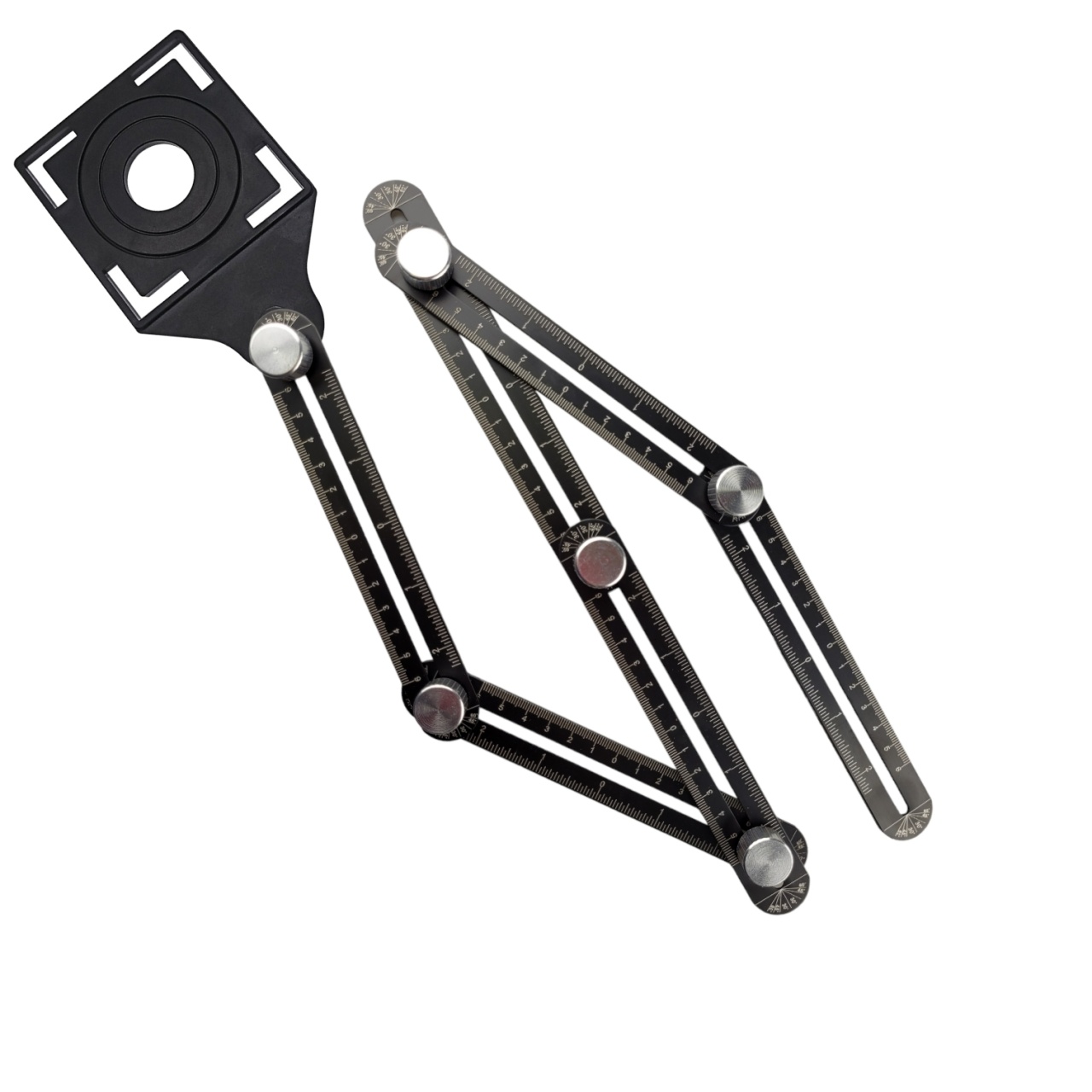 Строительная многоугловая измерительная линейка или шаблон плиточника 6х6см с направляющей для сверления имеет легкую и долговечную конструкцию, а также двустороннюю шкалу сантиметры и дюймы, которая позволяет использовать инструмент во многих сценариях, как линейку столяра, плиточника, мебельщика. Алюминиевые винты надежно фиксируют ее в сложенном положении и позволяют копировать отверстия на плитку любые иные поверхности легко и быстро.
