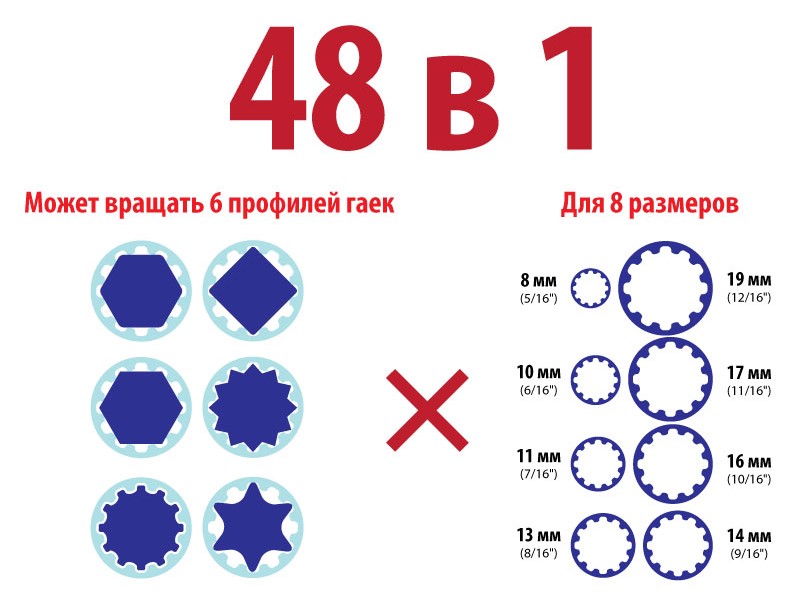 Универсальный ключ 48 в 1 – это набор головок диметром от 8 до 19 мм в одном ключе. Ключ может работать с шестью различными профилями гаек с восемью разными размерами. Особая конструкция головок, которые вращаются на 360°, позволяет откручивать и закручивать гайки и болты разной формы: квадратные, 6-гранные, 12-гранные, Torx.