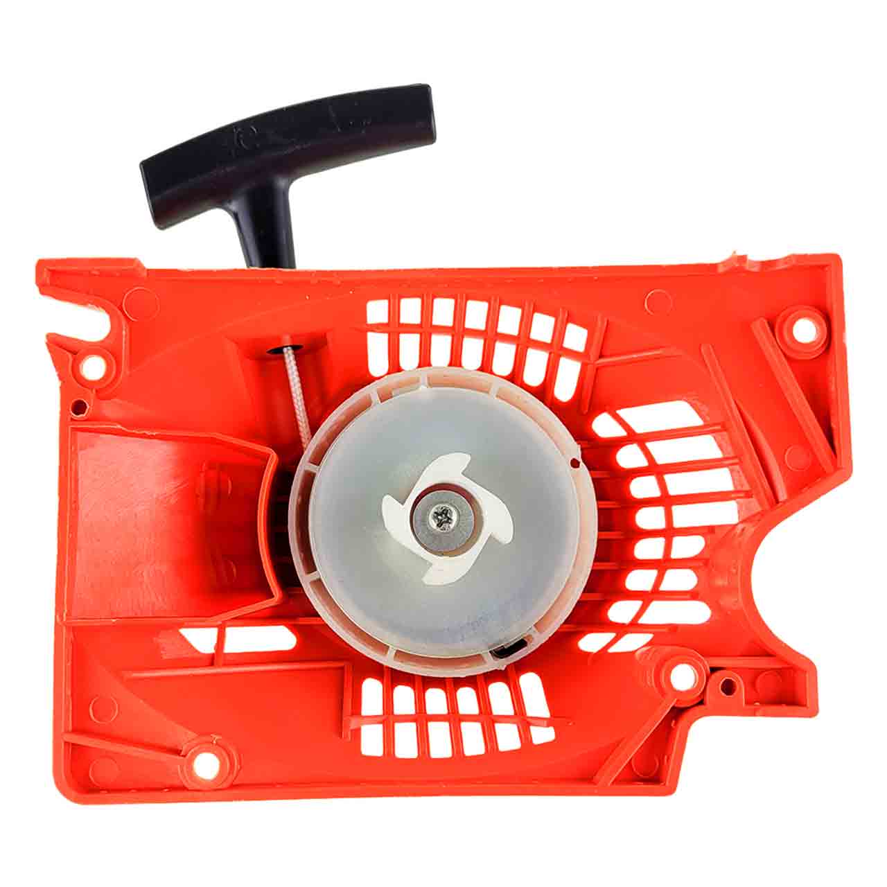 Стартер бензопилы усиленный имеет 4 зуба, которые обеспечивают надежное сцепление механизмов и качественную работу бензопилы. При ускоренном прокручивании коленчатого вала инструмента происходит сжатие подаваемой в двигатель топливно-воздушной смеси и её последующее воспламенение. Поэтому нормальная работа стартера для бензопилы определяет работоспособность всего механизма. Диаметр шкива 75 мм. Данный стартер выполнен из пластика включая шкив.