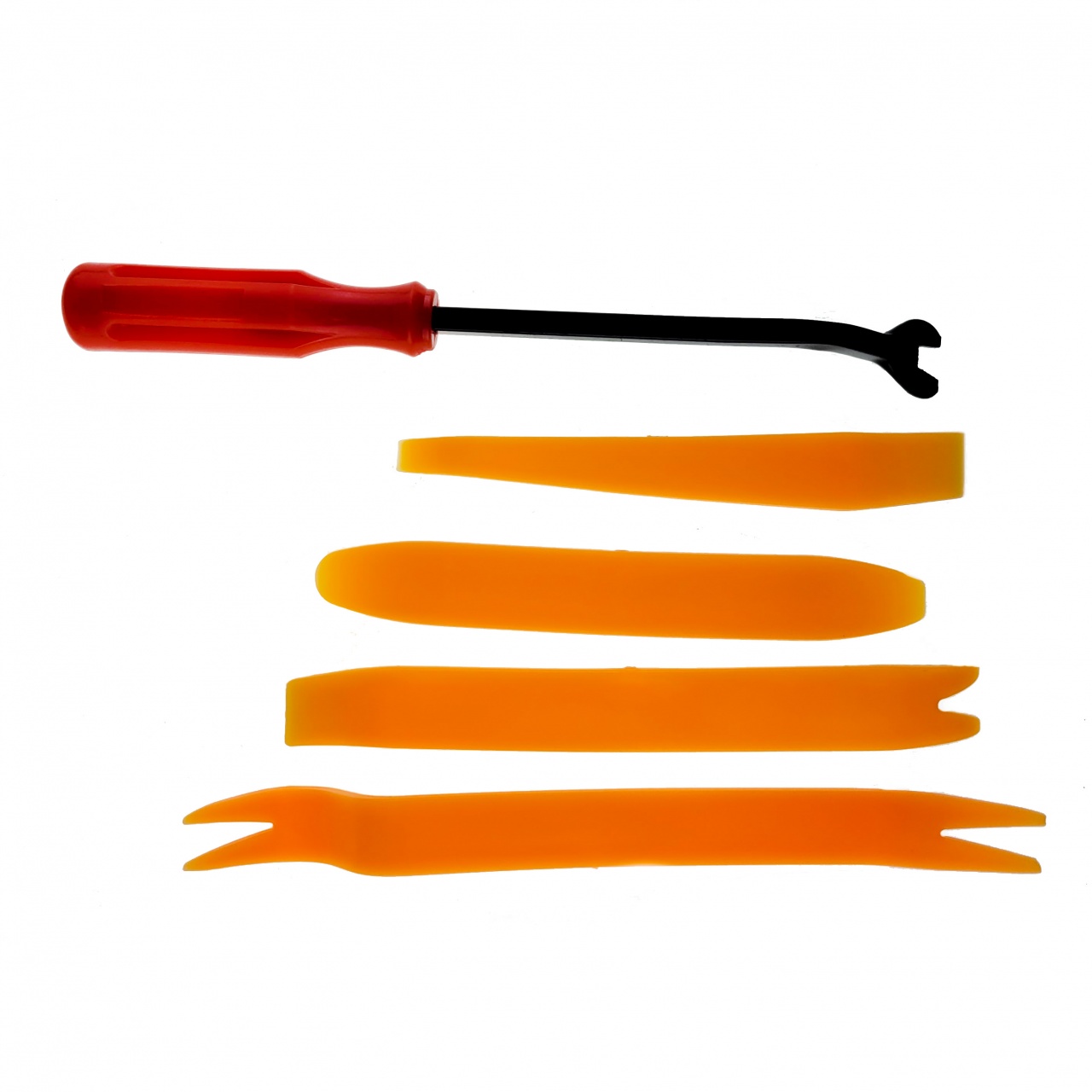 Набор ремуверов для снятия панелей облицовки включает в себя 5 предметов, которые не поцарапают и не повредят поверхности автомобиля.