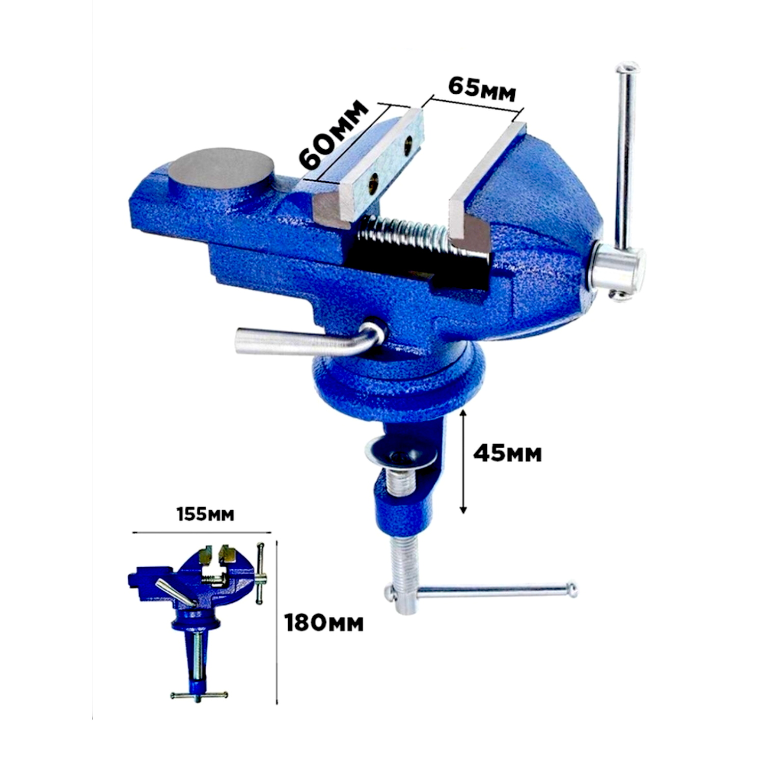 Ручные тиски 60 мм с поворотным механизмом 0°-360° и наковальней применяются для надежной фиксации заготовок.