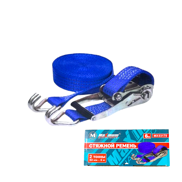 Стяжной ремень с храповым механизмом от " MAXIMUM QUALITY TOOLS" выполнен из прочной полиэстеровой ленты шириной 50 мм и выдерживает до 2 тонн. Ремень стяжка 6 метров оборудован регулировкой длины и не подвержен истиранию. Храповик и крюки выполнены из высокопрочной оцинкованной стали. Применение: крепление грузов при перевозке различными видами транспорта (авто, ж/д, морской).
